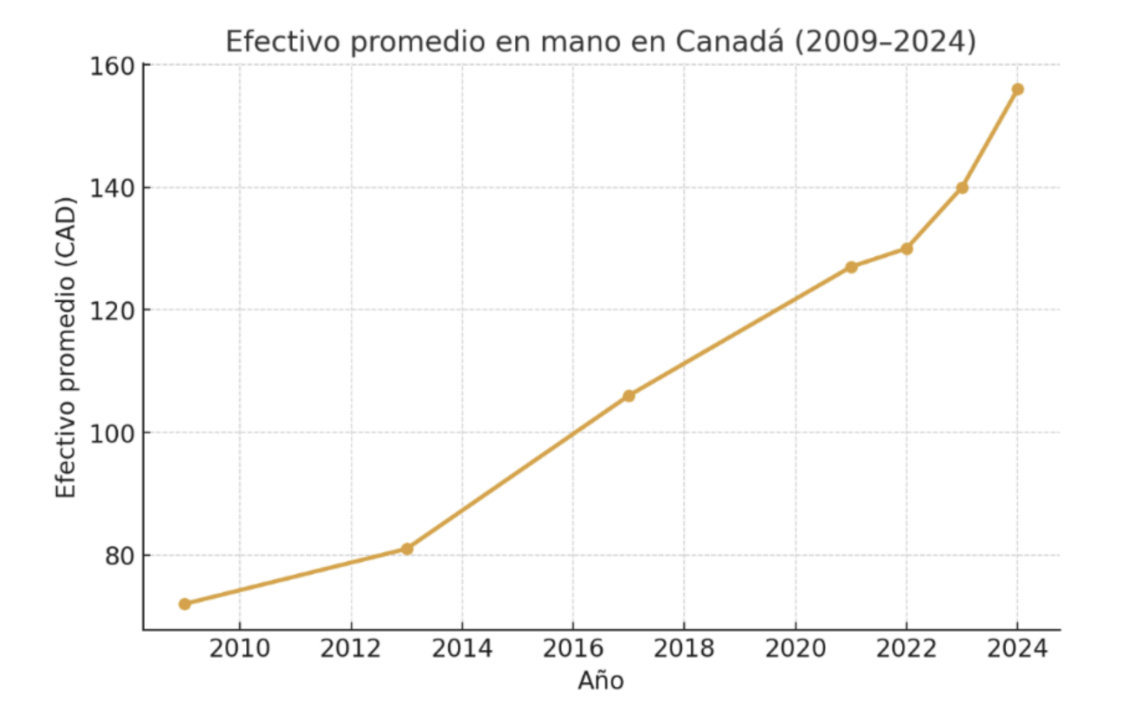 Muestra la tendencia ascendente con un salto de 140 en 2023 a 156 dólares en 2024, según el Banco de Canadá.