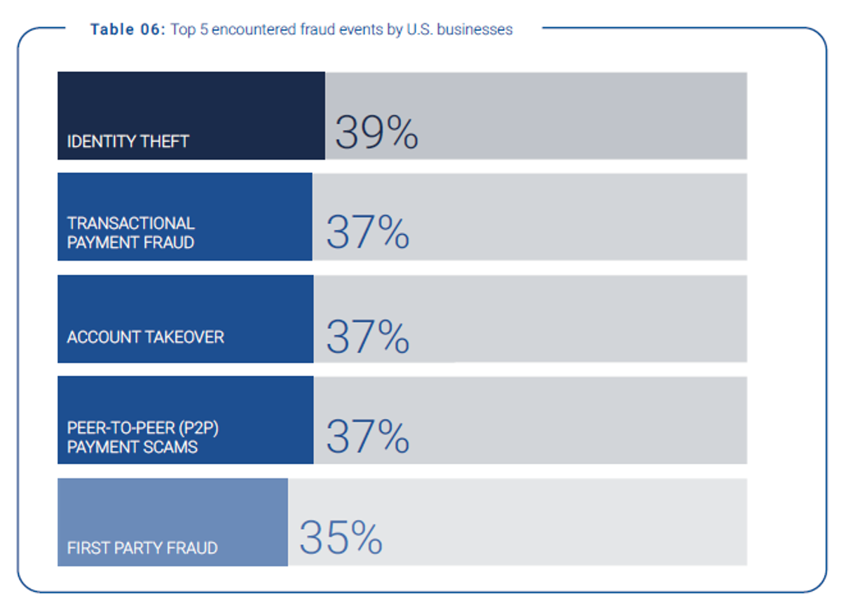 El siguiente gráfico resume los cinco tipos de fraude más habituales a los que se enfrentan las empresas estadounidenses, y deja una conclusión clara: el fraude dominante es identitario y transaccional.